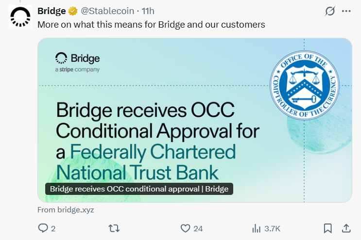 OCC has not yet announced the final approval. Currently, Bridge must meet specific requirements before receiving full authorization, and once approved, it will become a federally regulated stablecoin issuer in the U.S.