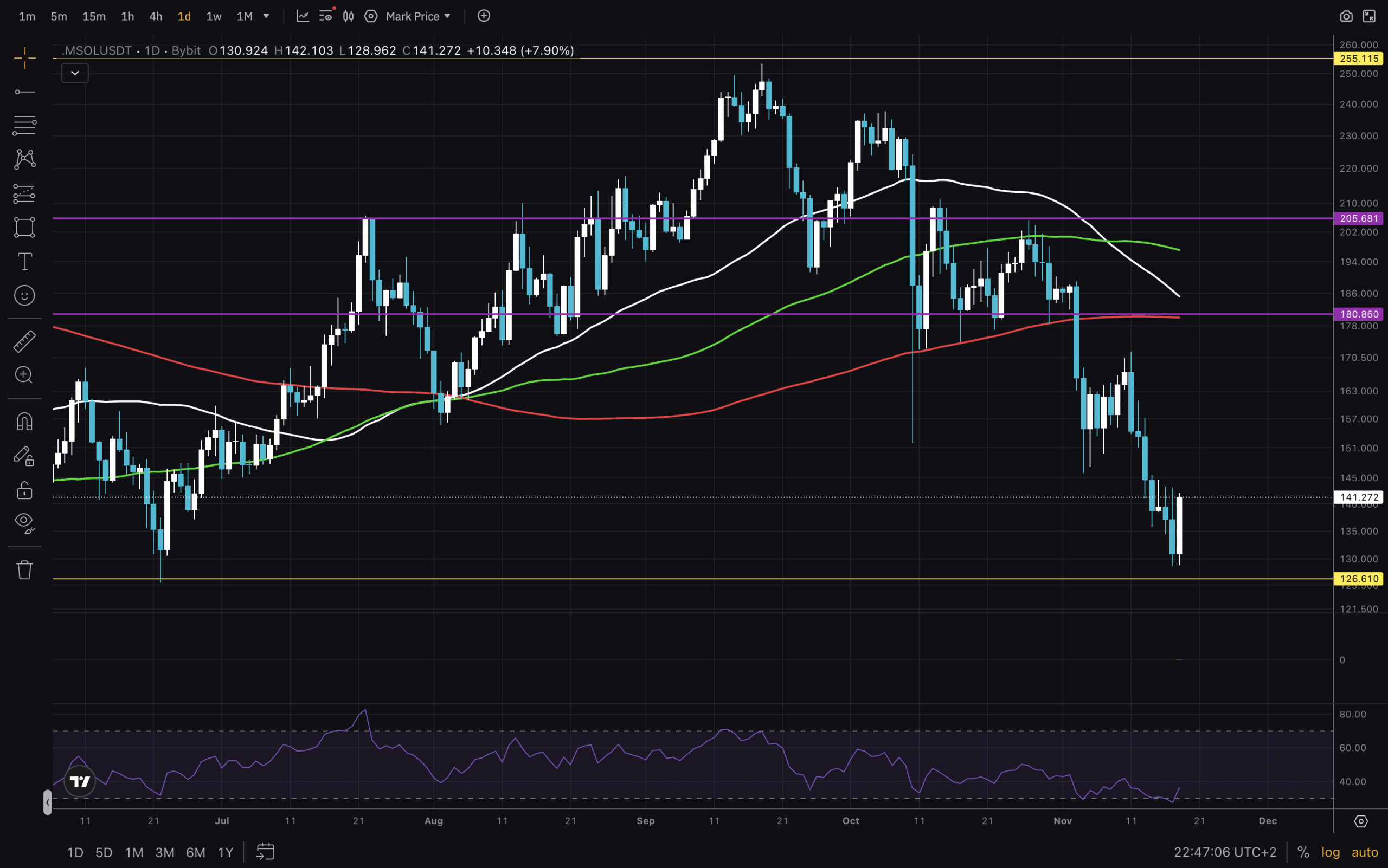Finally, we will explore the Daily chart. There is this key zone/range from $180 to $205 that was lost and not even retested afterwards. That goes to show that there wasn’t sufficient liquidity in that zone, and market makers decided to hunt buyers at lower prices. As it stands now, the Solana price is below all Moving Averages and needs to reclaim them all to make a new attempt at a new ATH. Next, we examine the RSI and see that it appears to have bottomed. Let’s wait and see what the Daily candle close looks like.