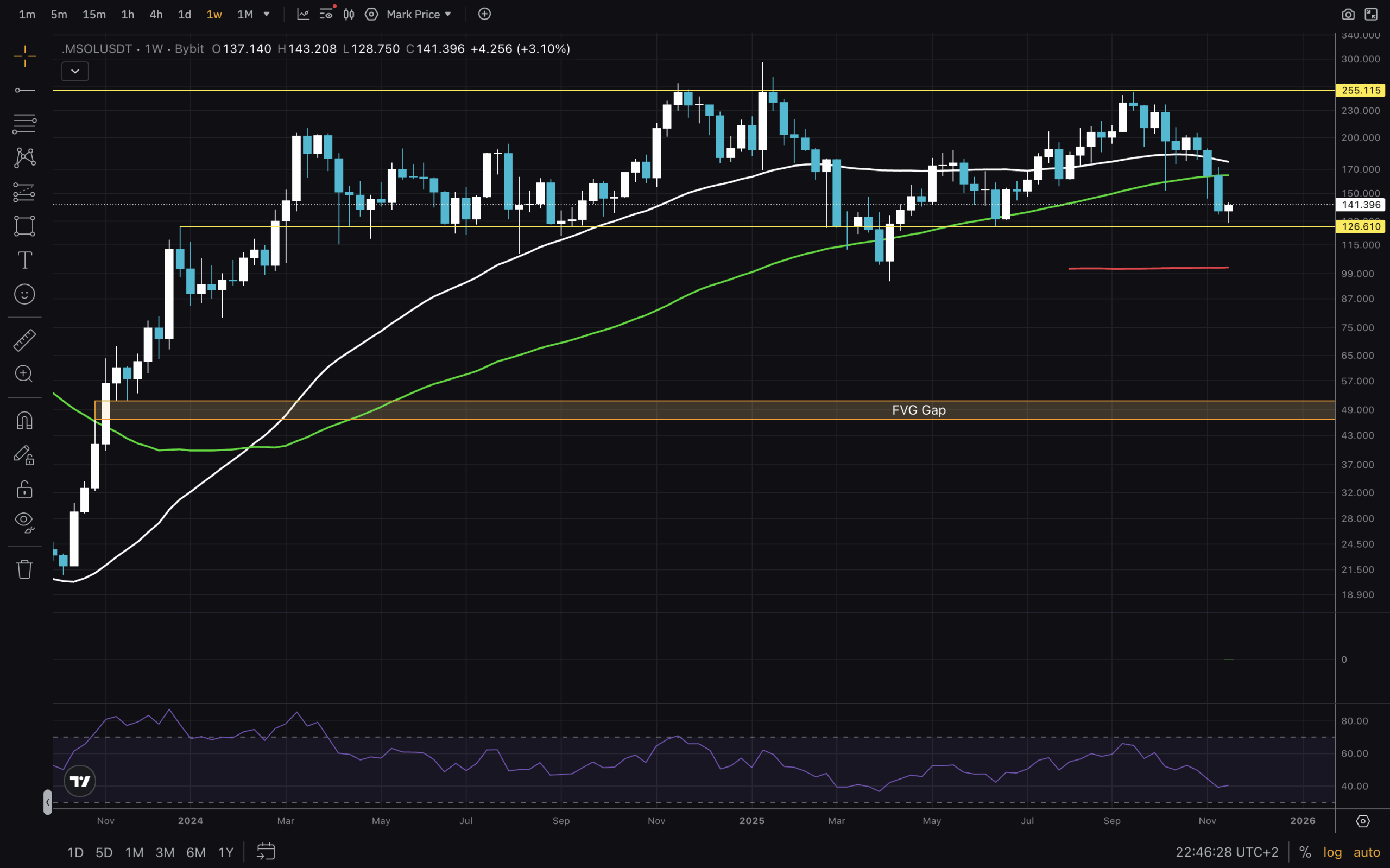 RSI has been fairly chill for more than a year as well. There is a weekly FVG between $46 and $51. Not shown on this chart are two Monthly FVGs as well. The higher one is between $68-$78, and the lower one is between $38-$58. This is the lowest possibility I personally see SOL dropping to.