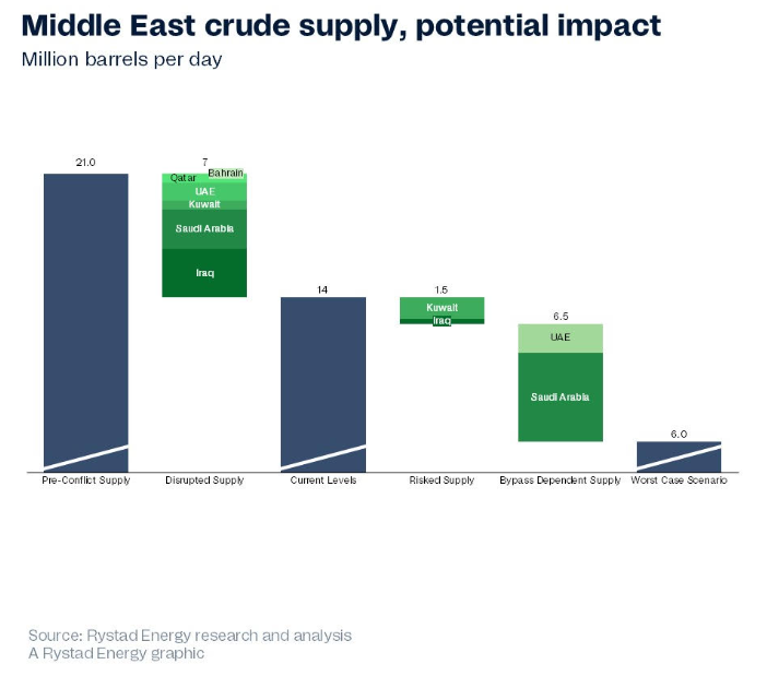 Excluding Iran, the Middle East's oil supply has dropped by 33% in just over a week, falling from a pre-conflict base of 21 million bpd to a current level of only 14 million bpd, according to Rystad Energy data.