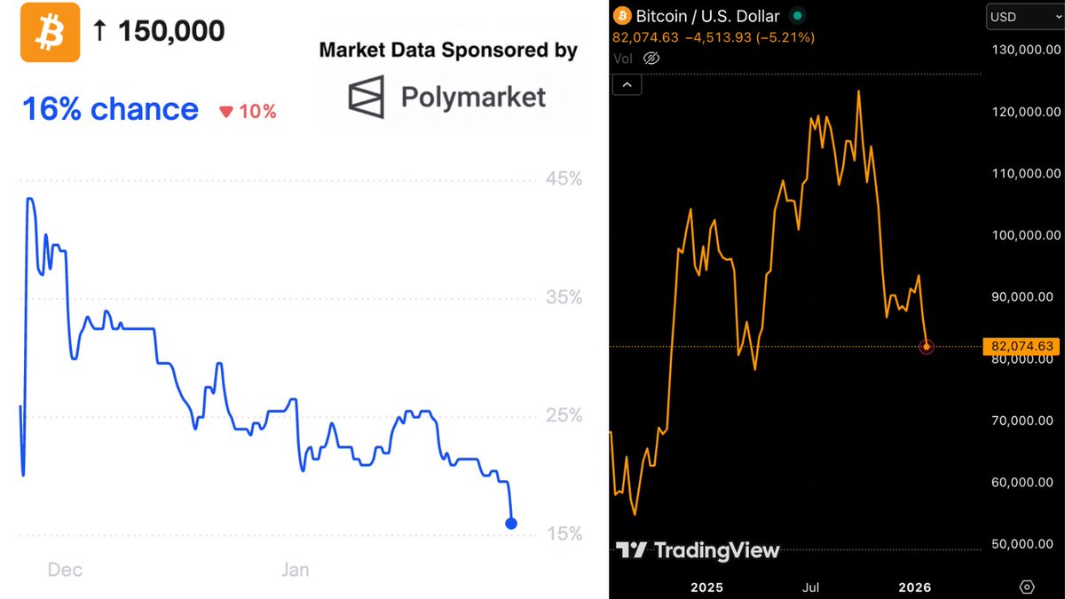 NEW: ODDS OF $BTC HITTING $150K IN 2026 DROP TO 16% ON POLYMARKET