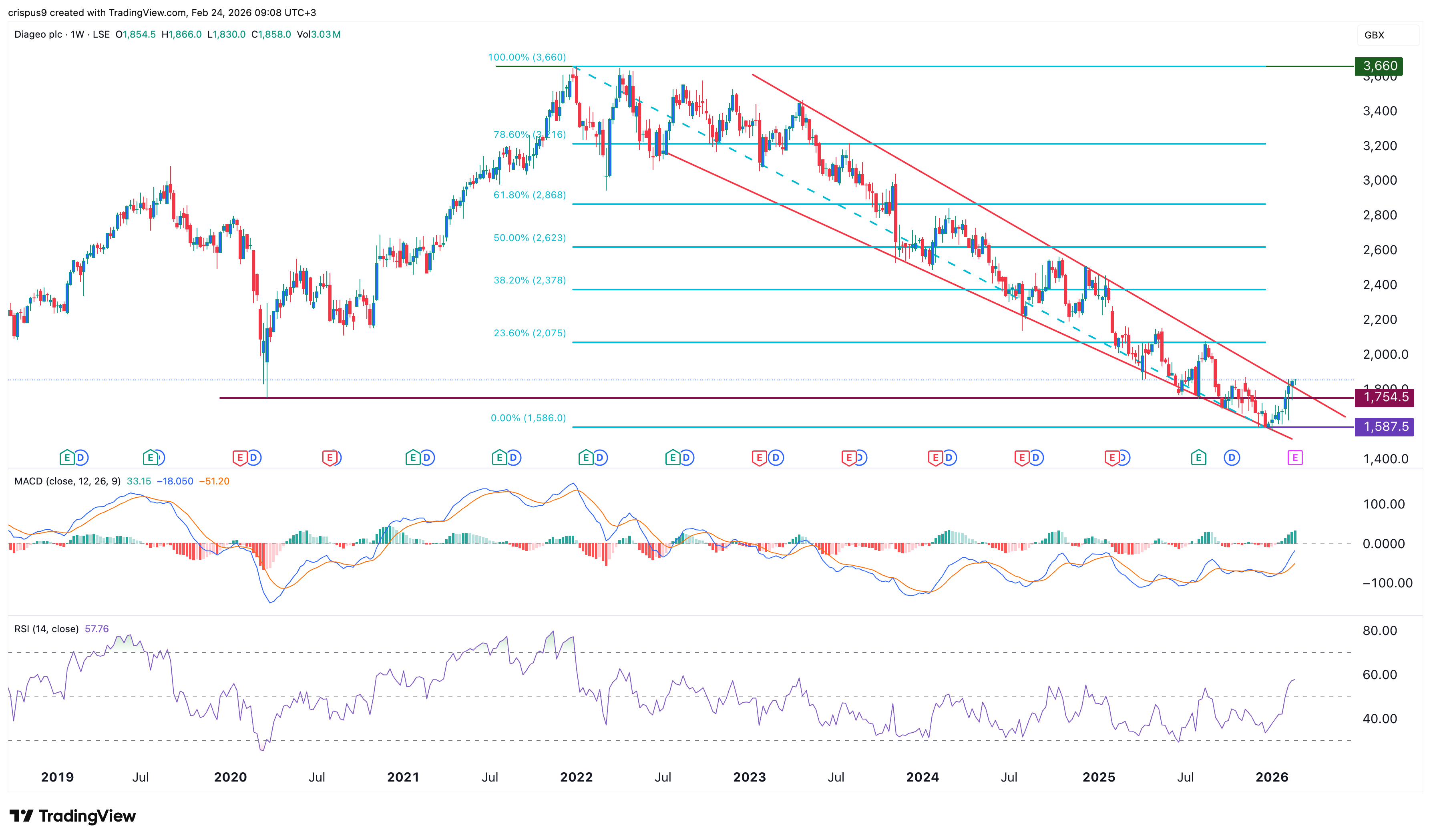 The weekly timeframe chart shows that the Diageo stock price has crashed from 3,660p in January 2022 to a low of 1,587p in December last year.