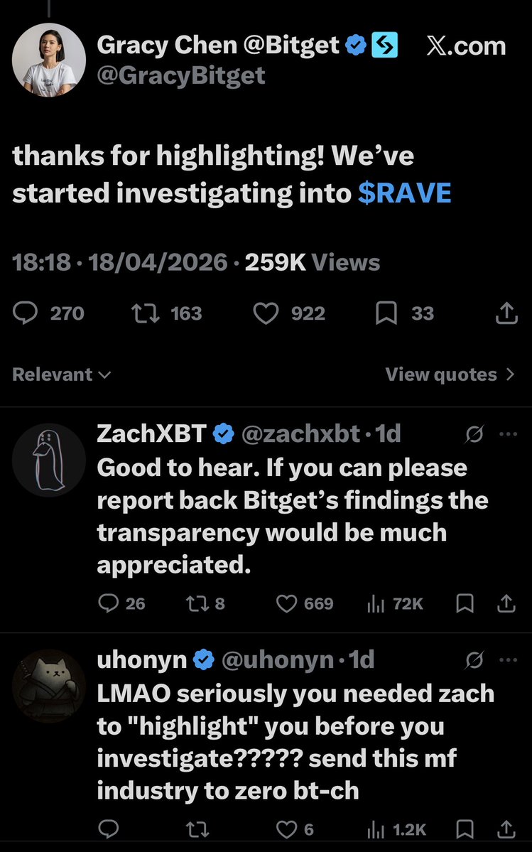 🚨 THE $RAVE SCANDAL IS GETTING BIGGER Three big exchanges that include Binance, Bitget, and , are now investigating. ZachXBT named all three, saying insiders used their platforms to create a huge short squeeze. Bitget CEO Gracy Chen confirmed the investigation right away. Binance CEO Richard Teng said they will check "all market misconduct." Gate's Kevin Lee said: "We're already on it. Protecting users is our top priority." RaveDAO is now crypto's latest insider manipulation story after $RAVE dropped over 95%, losing $6.3 billion in market cap in a massive crash. RaveDAO denies any involvement, while ZachXBT is offering $25K for whistleblowers. Who will actually be held accoun