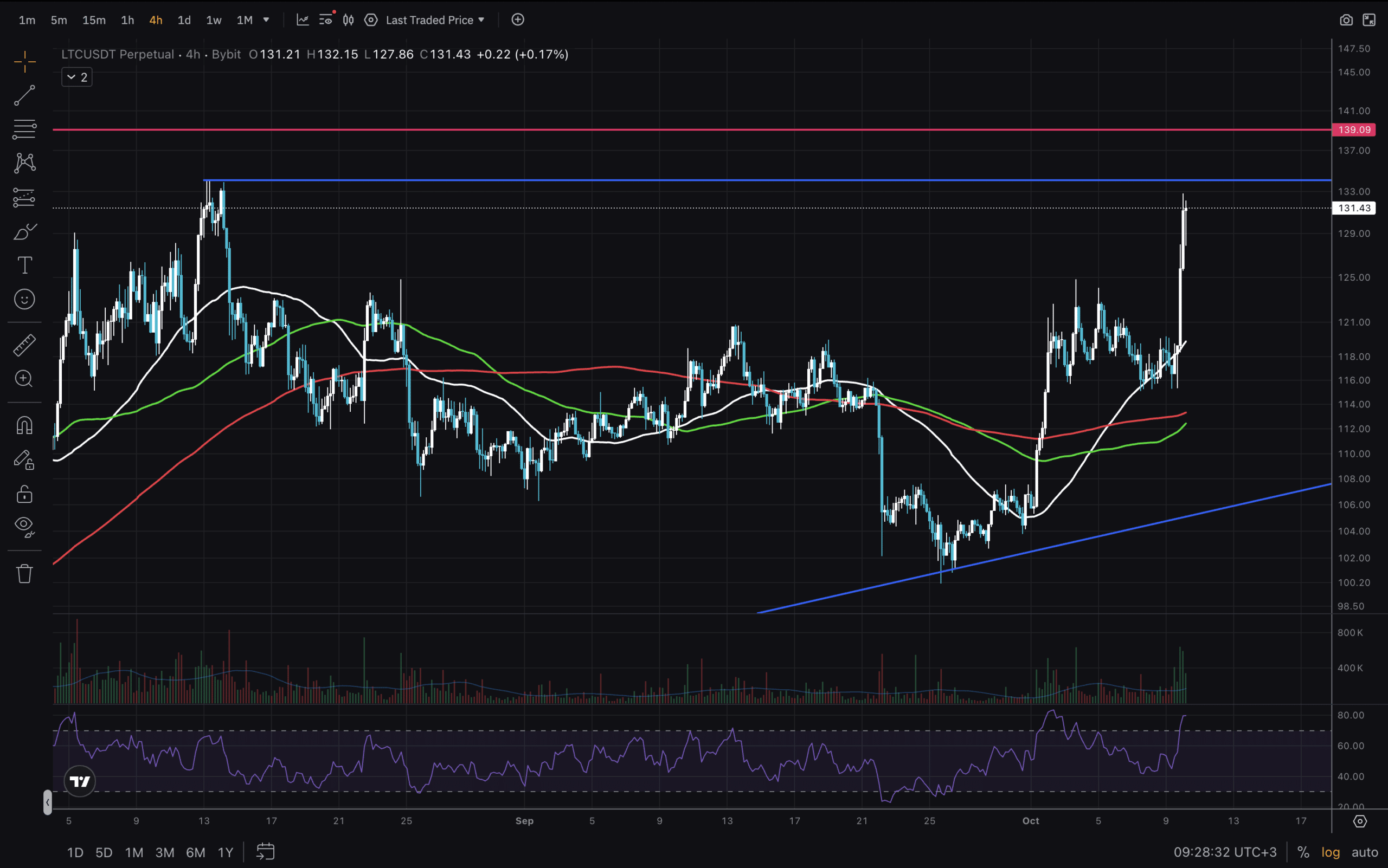That being said, on this Lower Timeframe, 4H chart, we see a strong impulse to the upside, after LTC USD reclaimed all Moving Averages. Accompanied by a surge in volume, it can mean that bulls are stepping in. An entry here with a stop below $100 makes 1R = $30.