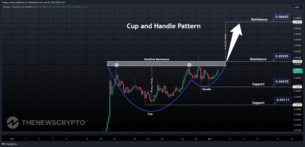 In the above chart, VeChain (VET) laid out the Cup and Handle pattern. It emerges when a security’s price movement takes on the shape of a “cup,” followed by a downward-trending pattern forming the “handle. This decline, or the handle, is considered a signal for a buying opportunity to adopt a long position.