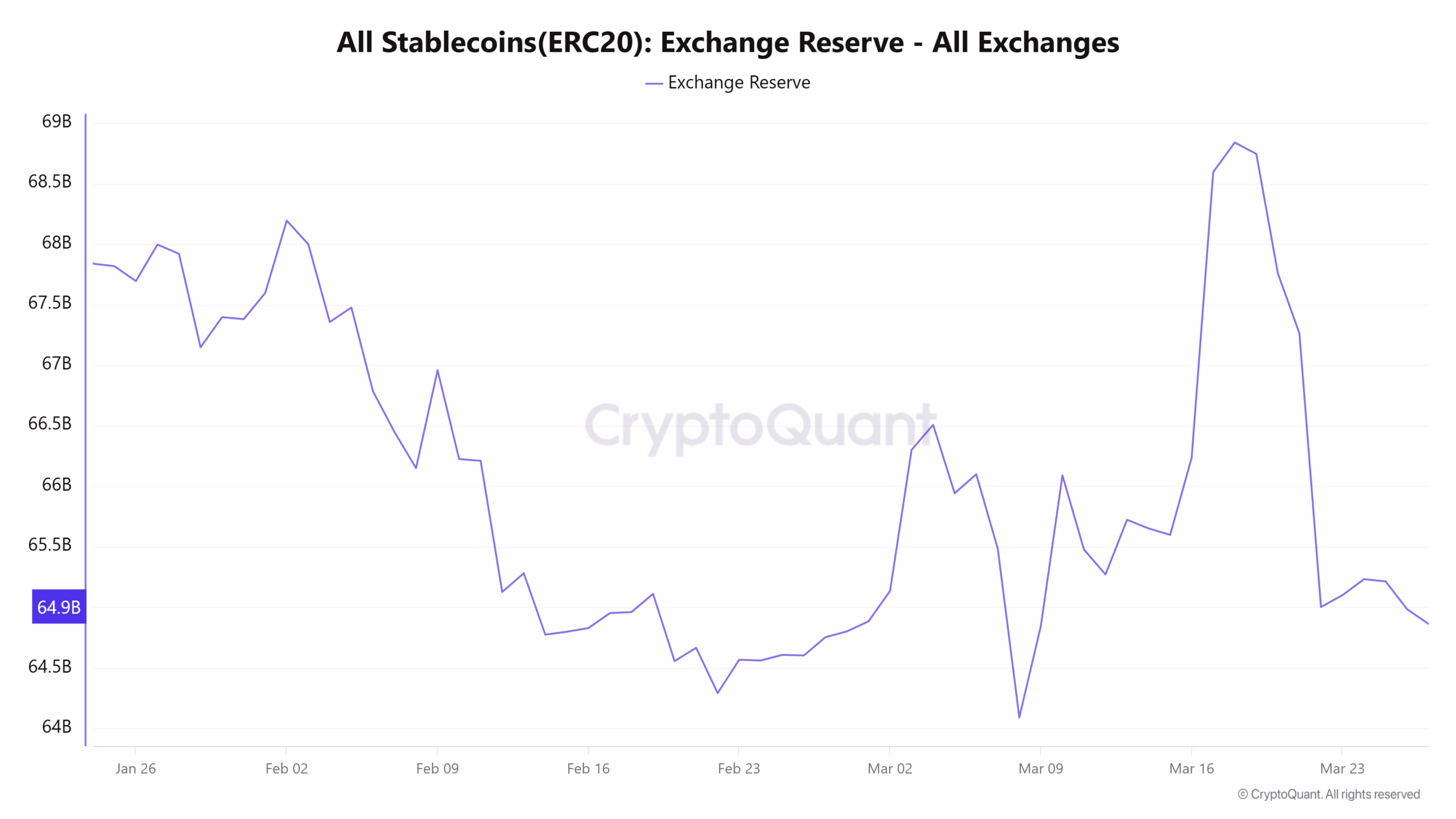 The stablecoin exchange reserve surged in response to the new inflow. It is worth noting that it had been on a decline for months before March. It was at $64.8 billion as of Mar 1 and peaked at $68.8 billion a few days later.