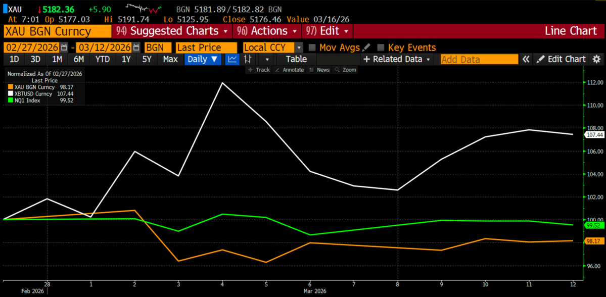 🔥 HAYES: Bitcoin has outperformed traditional assets since the US–Iran war began on Feb. 28.$BTC is up ~7% over the period, while gold is down ~2% and the Nasdaq-100 is slightly negative. pic.twitter.com/DR45IP6sIN
