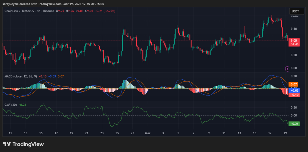 The Moving Average Convergence Divergence (MACD) line of Chainlink is below the zero line, and the signal line is positioned above it. Thus, the broader trend is weak, but the recent price action is trying to stabilise or turn upward. Notably, the market is in a transition phase.