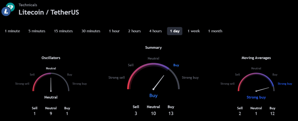 The technical analysis indicators such as Relative Volume (RVOL), Moving Average (MA), and Relative Strength Index (RSI) of Litecoin (LTC) are shown in the chart below.