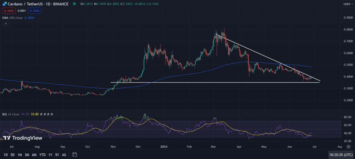 - From 13 April 2024, Cardano has been trading between $0.52 and $0.401, with strong support at the $0.4 mark. It has retested this zone twice and rejected it, which suggests that recovery may be possible once this consolidation period ends.