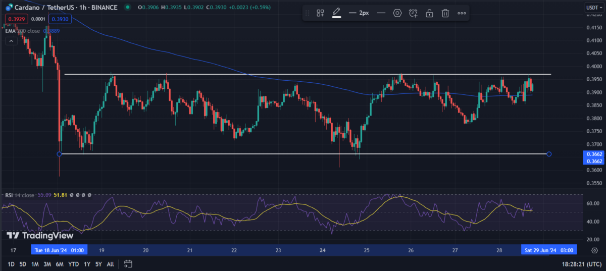 Overall, Cardano has been quite volatile on the 1-hour chart. We can see it consolidating sideways in a range of $0.395 and $0.34. Currently, it is gearing to retest the upper support line, even though it has tested it several times and bounced back d own.