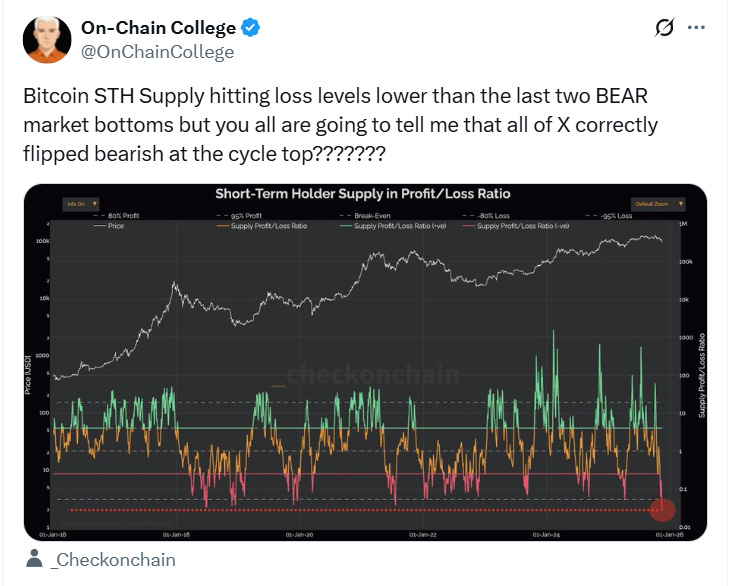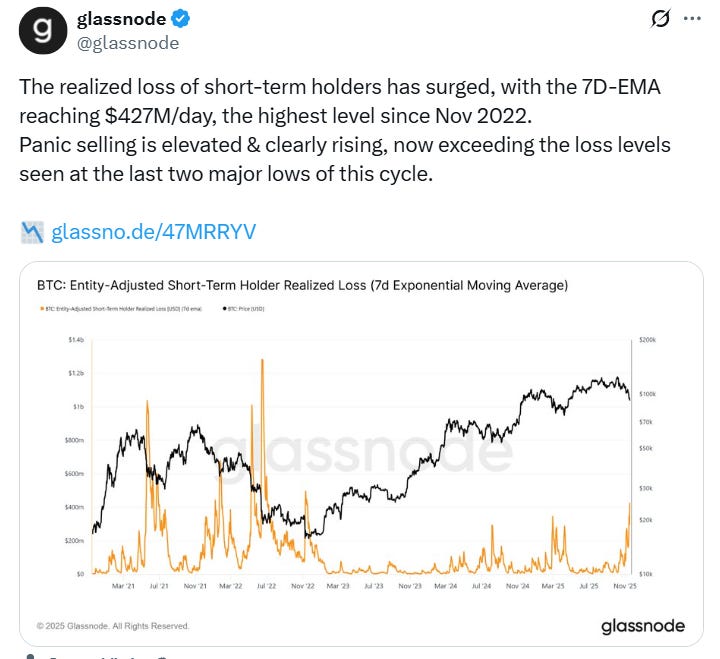 “Short-term #Bitcoin holders are already in extreme pain, comparable to previous corrections in April 2025 (‘tariff shock’) or August 2024 (‘Yen Carry Trade Unwind’),” wrote Bitwise’s head of research, André Dragosch.