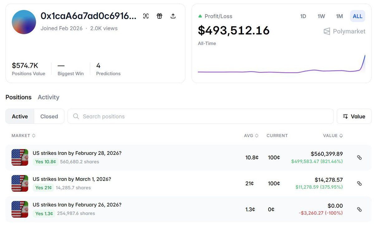 🚨 NOW: A 3-day-old polymarket wallet made $493K profit from the US strikes on Iran. pic.twitter.com/OCjuRc2xlN
