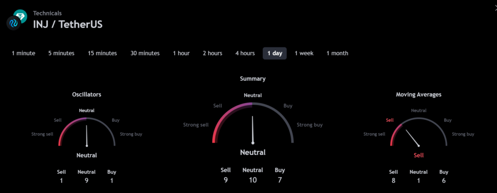 The technical analysis indicators such as Relative Volume (RVOL), Moving Average (MA), and Relative Strength Index (RSI) of Injective (INJ) are shown in the chart below.