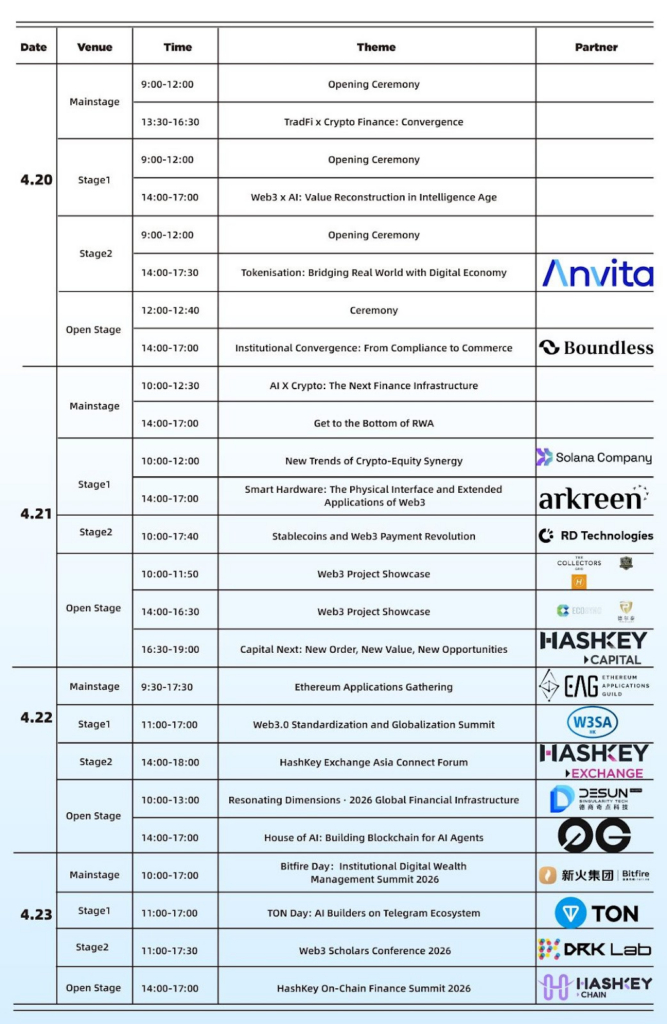 The Hong Kong Web3 Festival today released its full schedule for the 2026 edition, taking place from April 20 to 23 at the Hong Kong Convention and Exhibition Centre.