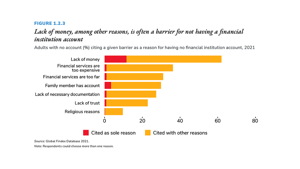 “Sixty-two percent of the unbanked cited ‘lack of money’ as one of multiple responses. In other words, people typically replied that they do not have enough money, and then included another barrier, such as financial services are too expensive to use or too far away. These answers suggest that people would open an account if banking costs were lower or if the banks were located more conveniently.”