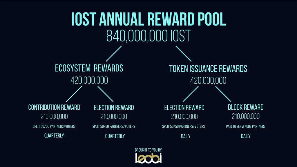 Nodes with more than 2.1 million votes are eligible to share a reward pool of 4% IOST total supply (840,000,000 IOST) every year, in which 25% are election rewards, 25% are block production rewards, and 50% are contribution rewards. Read more.