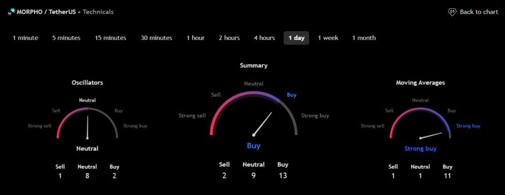 The technical analysis indicators such as Relative Volume (RVOL), Moving Average (MA), and Relative Strength Index (RSI) of Morpho (MORPHO) are shown in the chart below.