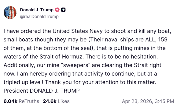 Then on Thursday, Trump posted on Truth Social that he has ordered the Navy to "shoot and kill any boat" laying mines near the Strait of Hormuz, adding that minesweeping operations would continue "at a tripled up level."