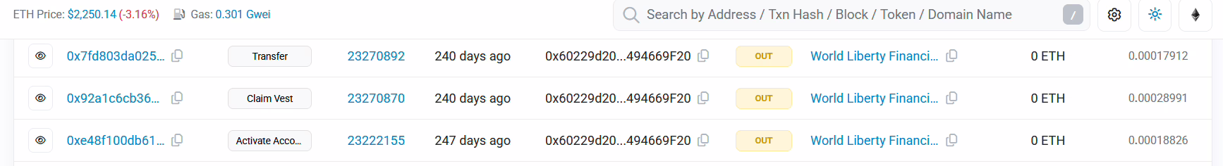 The largest wallet, moonmanifest.eth, leads with about 800.5 million WLFI, representing roughly 12.5% of the total votes. On-chain records show repeated transfers and claim vest transactions tied to the official WLFI contract, indicating early sale participation.
