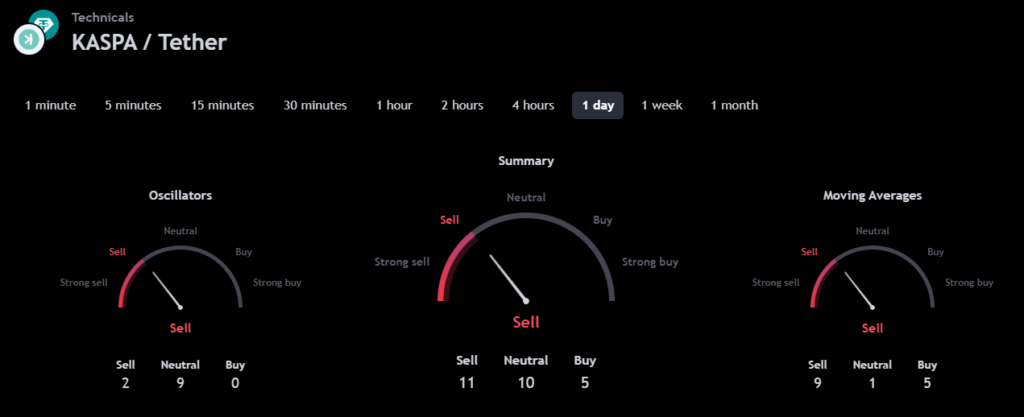 The technical analysis indicators such as Relative Volume (RVOL), Moving Average (MA), and Relative Strength Index (RSI) of Kaspa (KAS) are shown in the chart below.