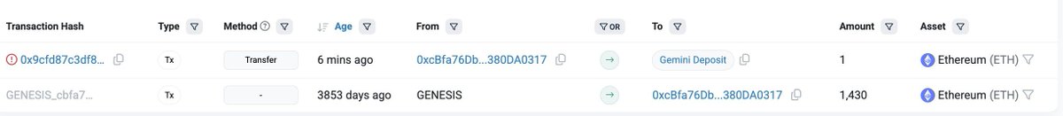 🔥 LATEST: An early Ethereum ICO investor awakens after 10.6 years of dormancy attempting to move 1 $ETH to Gemini but the transaction fails.
