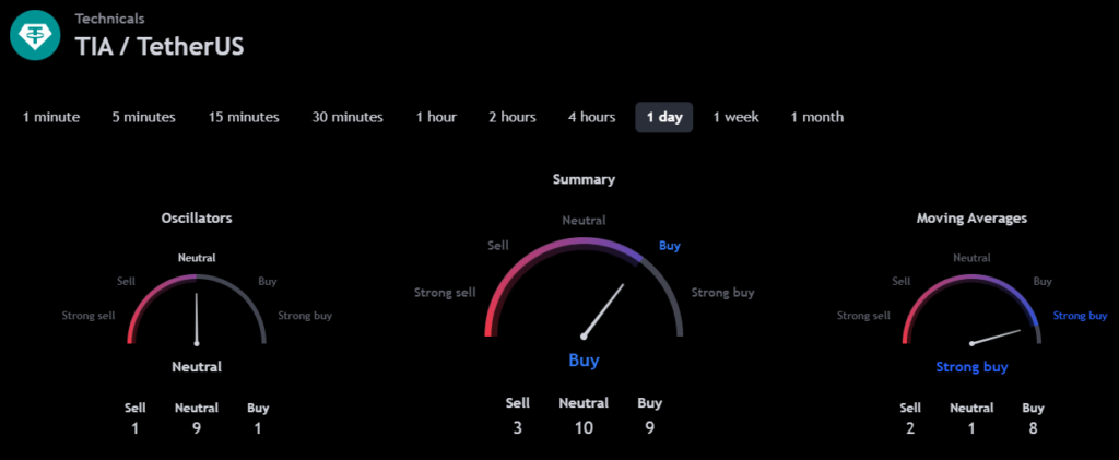 The technical analysis indicators such as Relative Volume (RVOL), Moving Average (MA), and Relative Strength Index (RSI) of Celestia (TIA) are shown in the chart below.