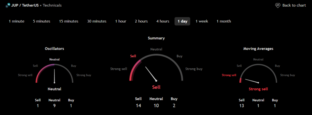The technical analysis indicators, such as Relative Volume (RVOL), Moving Average (MA), and Relative Strength Index (RSI) of Jupiter (JUP), are shown in the chart below.