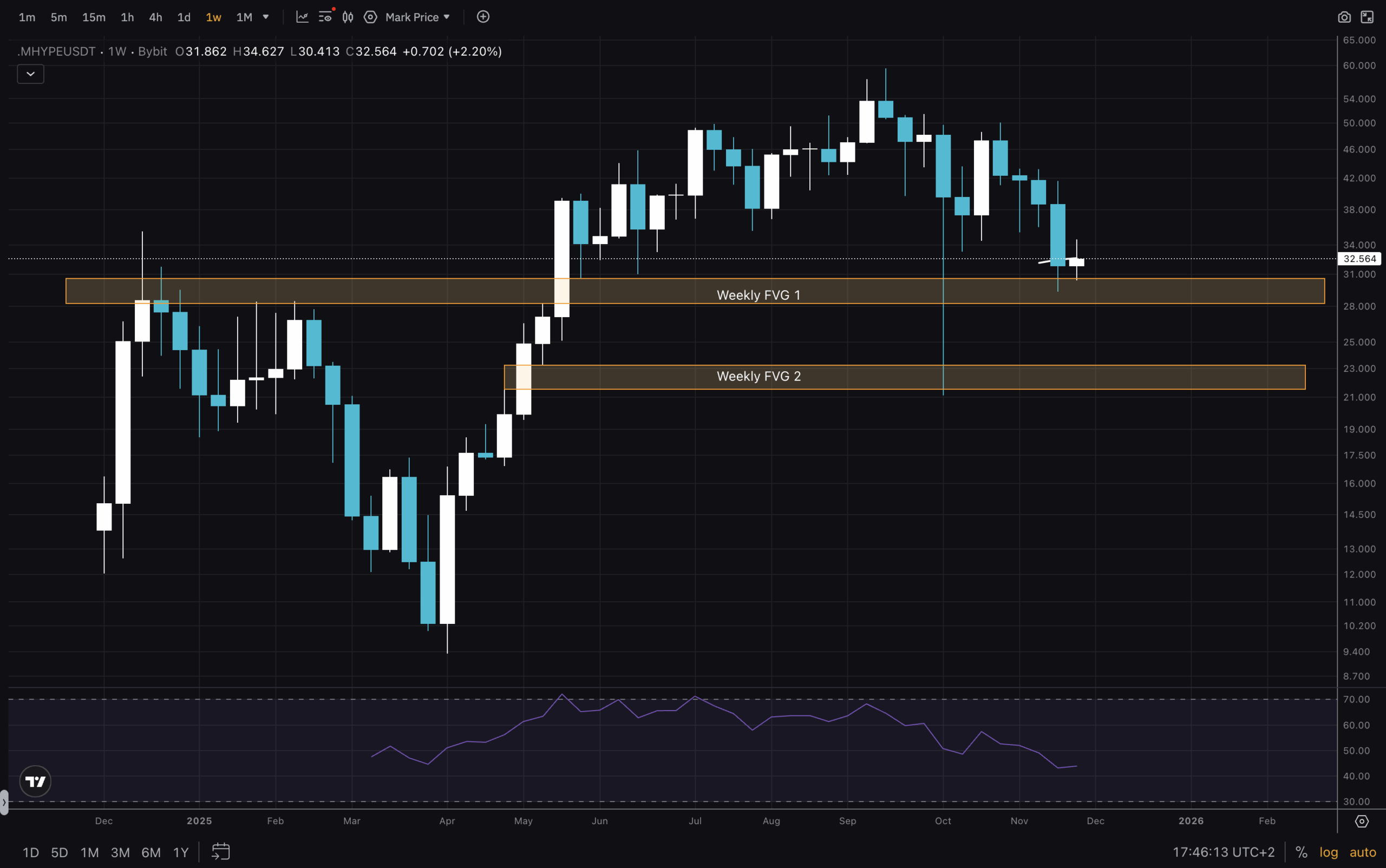 Starting today’s HYPE USD analysis, we first glance at the 1W chart. It shows us two Weekly FVGs, one of which is being tested and filled now. This is our first support zone – between $28-$30. The bottom FVG is roughly between $21-$23, and it could be an important level for the future. No moving averages here to observe, but RSI has been steadily dropping and is currently around midrange.