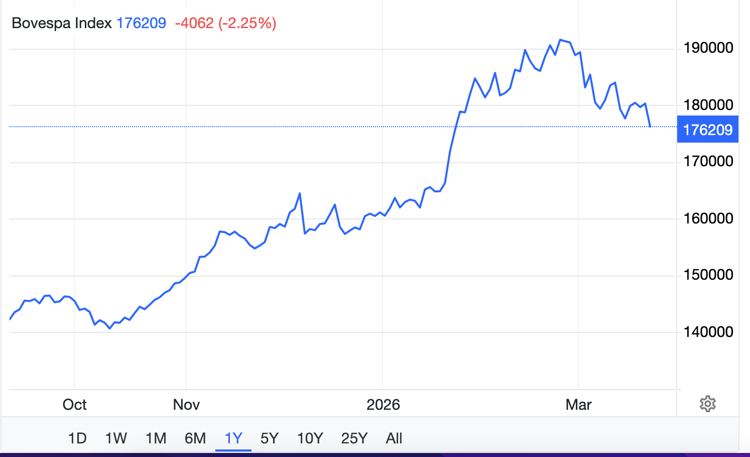 Brazil’s benchmark Ibovespa fell about 1% on Friday, slipping below the 179,000 mark as investors recalibrated expectations in response to a more cautious tone from central banks and escalating geopolitical tensions in the Middle East.