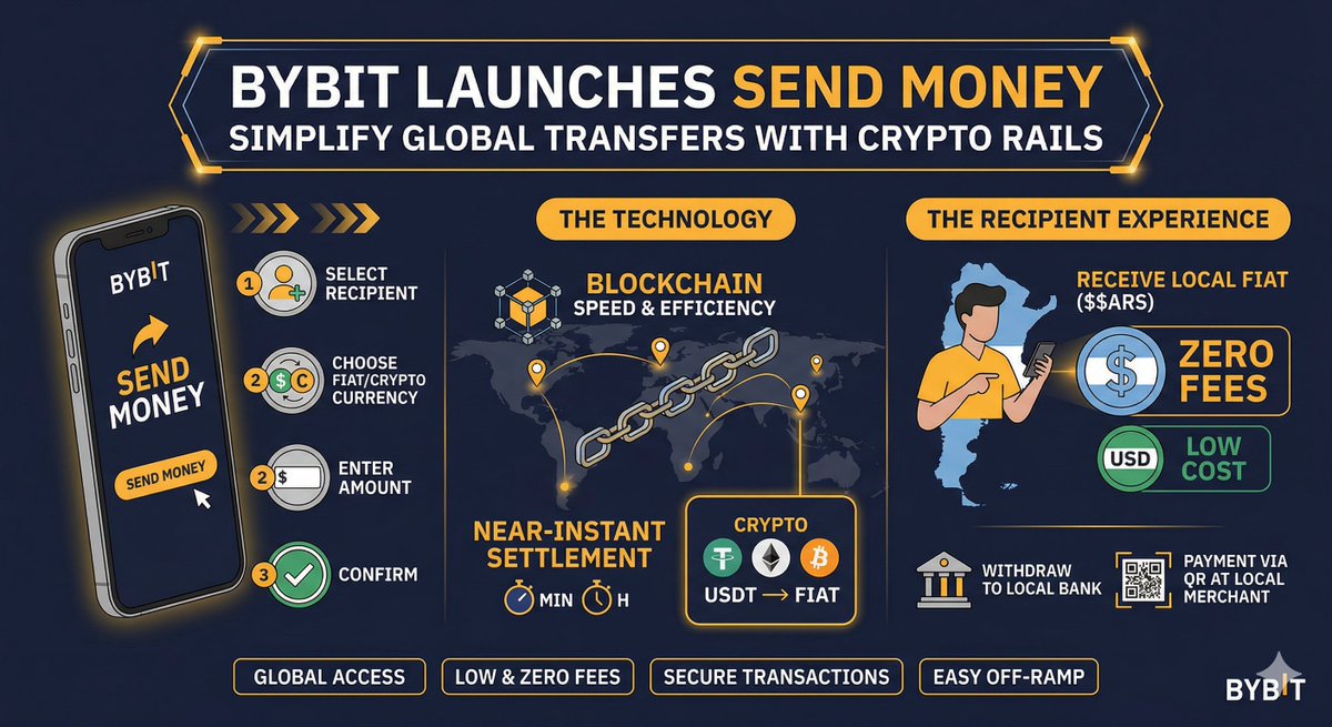 💳 Crypto rails. Fiat familiarity. Today, @Bybit_Official officially enters the payments space with the launch of Send Money. We’re bridging the gap between blockchain efficiency and everyday utility, starting with seamless transfers to Argentina. 🔹 Zero Fees: $ARS transfers at no cost to the recipient. 🔹 Speed: Transactions finalized in minutes, not days. 🔹 Accessibility: No crypto expertise required—just fast, secure global transfers. The future of remittance isn’t just coming; it’s here.