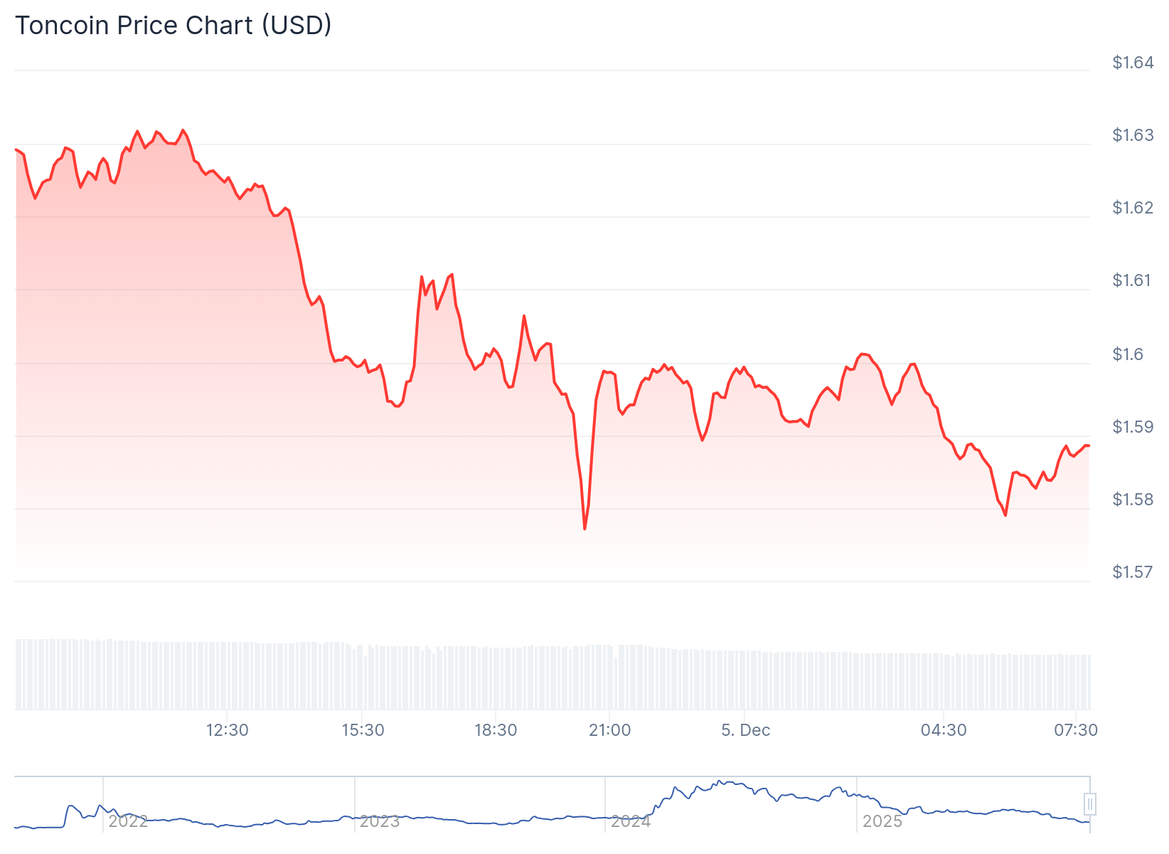 At the time of writing, TON is trading at $1.58, following a 2.7% decline in the past 24 hours with a market cap of $3.87 billion and a trading volume of $87.56 million. In its 7-day-to-date price change variable, the asset declined by 2.1%, with price extremes fluctuating between $1.46 and $1.66.