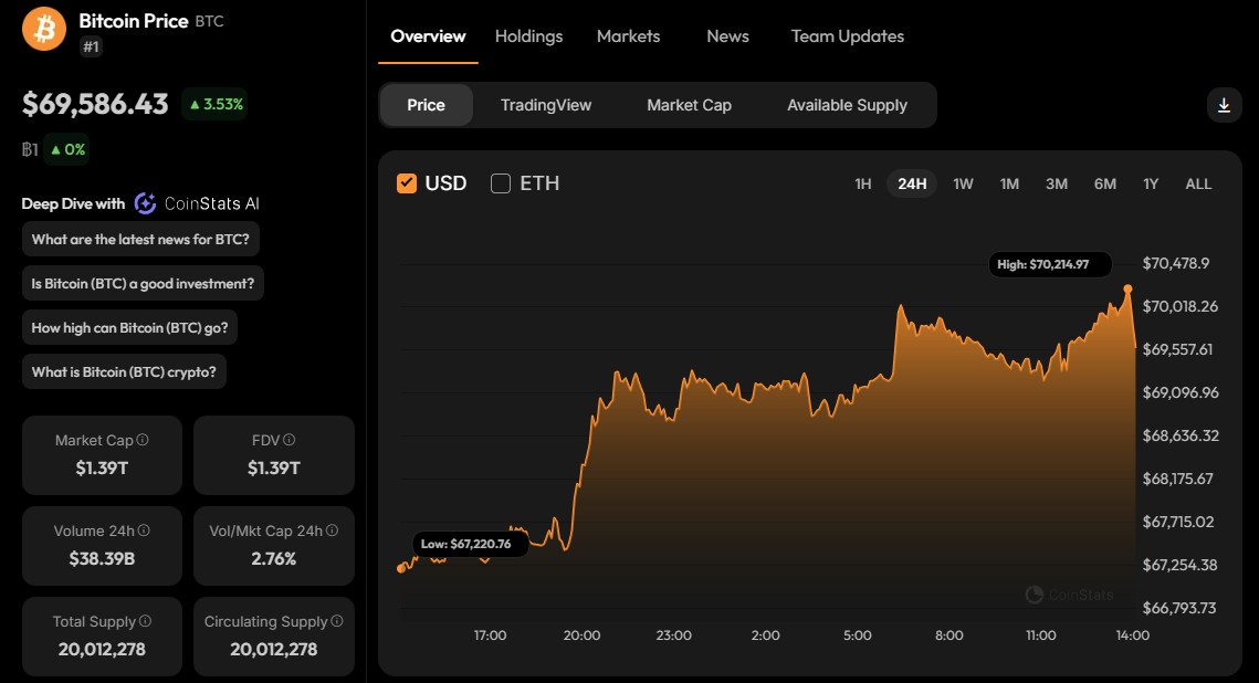 Após subir 2,5% neste domingo (5), o Bitcoin valorizou outros 2% nesta segunda-feira (6) e voltou a ser operado acima dos US$ 70.000, seu maior preço dos últimos 10 dias. Outras criptomoedas acompanham a tendência.