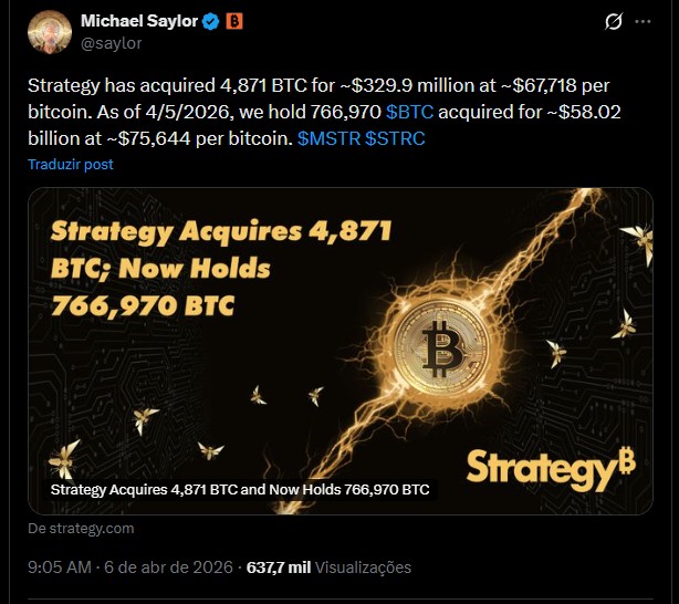 “A Strategy adquiriu 4.871 BTC por cerca de US$ 329,9 milhões, a aproximadamente US$ 67.718 por bitcoin. Em 5 de abril de 2026, detemos 766.970 BTC adquiridos por cerca de US$ 58,02 bilhões, a aproximadamente US$ 75.644 por bitcoin. $MSTR $STRC”