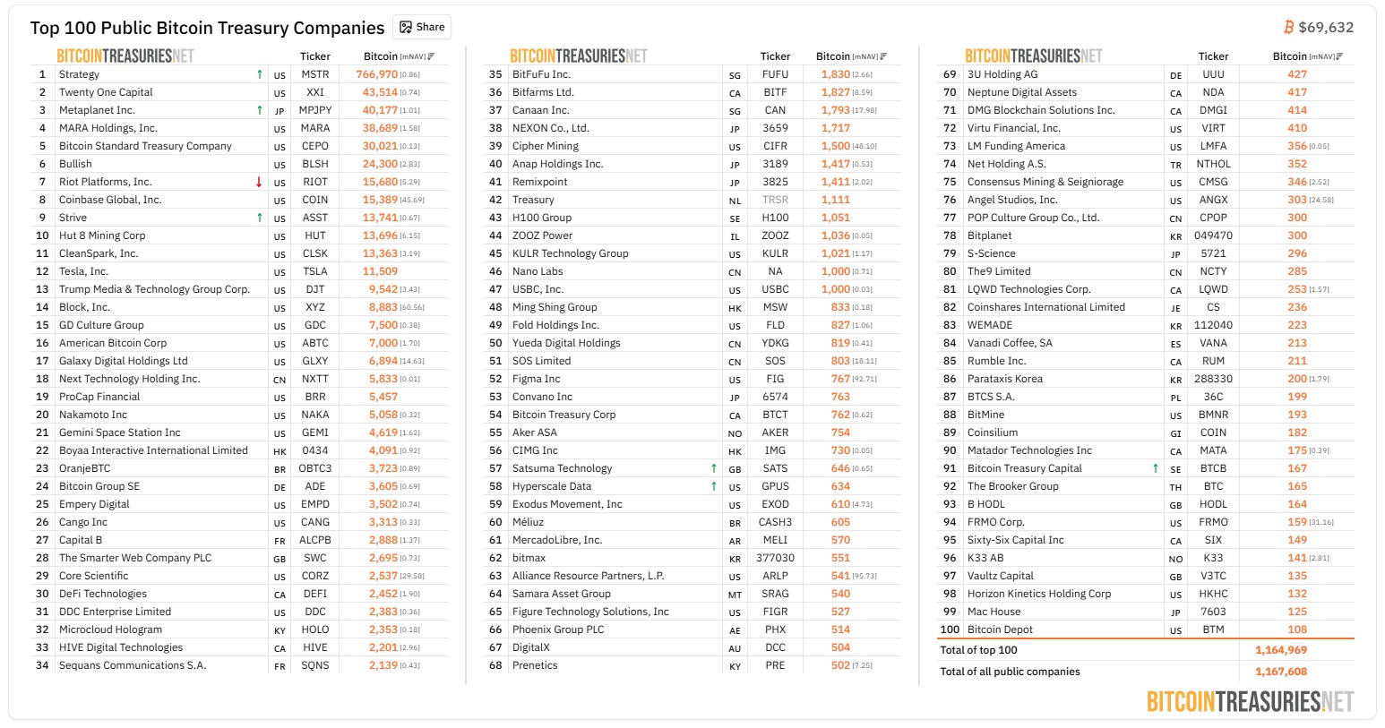 Dados do Bitcoin Treasuries mostram que a empresa de Saylor detém 65,7% dos bitcoins mantidos por empresas públicas. Dentre as mudanças recentes está a subida da Metaplanet para a 3ª colocação após um aporte de 5.075 bitcoins e a queda da mineradora Mara Holdings para a 4ª posição após a venda de 15.133 moedas.