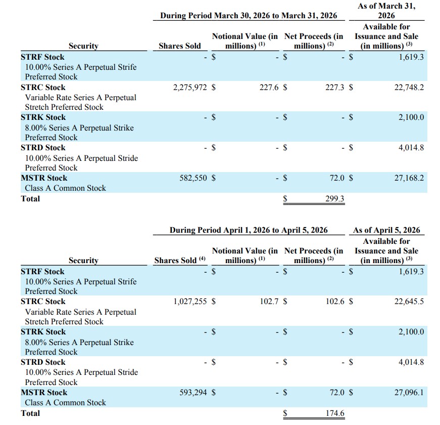 Um documento enviado à SEC revela que a empresa arrecadou US$ 329,9 milhões através da venda de STRC e outros US$ 142 milhões pela venda de MSTR entre os dias 30 de março e 5 de abril.