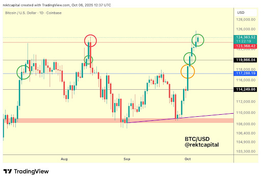 Bitcoin performed a crucial daily close above the key $123,400 area, confirming the breakout, a trade setup that remains valid until Bitcoin remains above this key support level 🛡️, according to crypto analyst Rekt Capital.