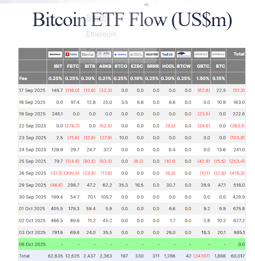 The spot Bitcoin ETFs have been a significant catalyst to Bitcoin’s all-time high 🚀 this week, as these funds saw 5 days of uninterrupted inflows 📈, with $985 million on October 3 to close the past week.