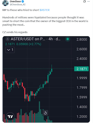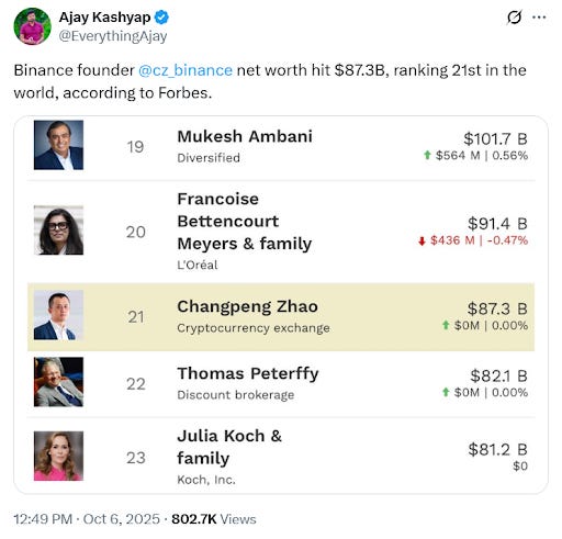 CZ’s net worth is rising to new peaks ⛰️ as both BNB and ASTER are hitting renewed all-time highs 📈.