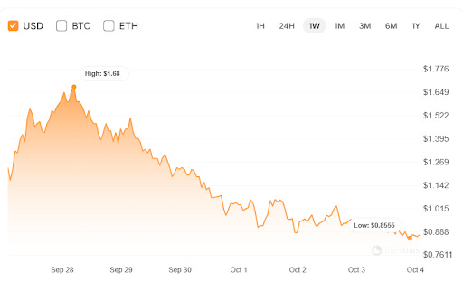 The XPL token saw a major correction, falling 30%📉 during the past week to lose the $1 psychological threshold, erasing over half of its value compared to the $1.68 📊 all-time high on September 28, according to CoinStats data.