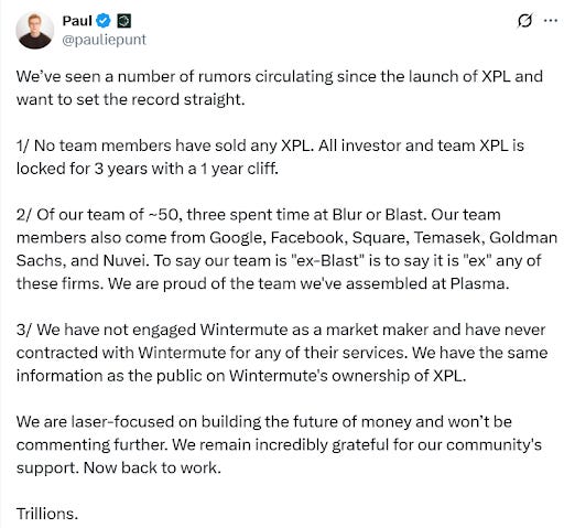 Plasma’s founder, Paul Faecks, denied the circulating rumours ❌, highlighting that all team tokens are locked 🔒 for 3 years: