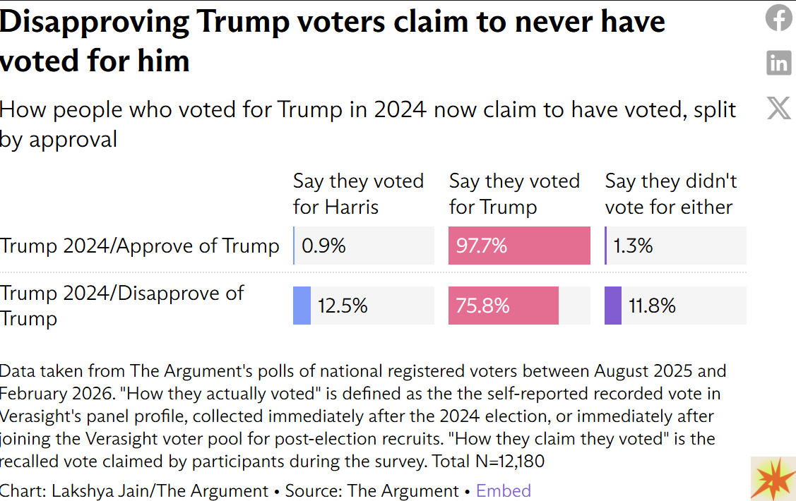 The pattern runs in both directions. Harris voters who now approve of Trump are more likely to claim they voted for him. Researchers describe this as preference reconciliation. People adjust their memory to align with current feelings.