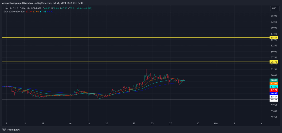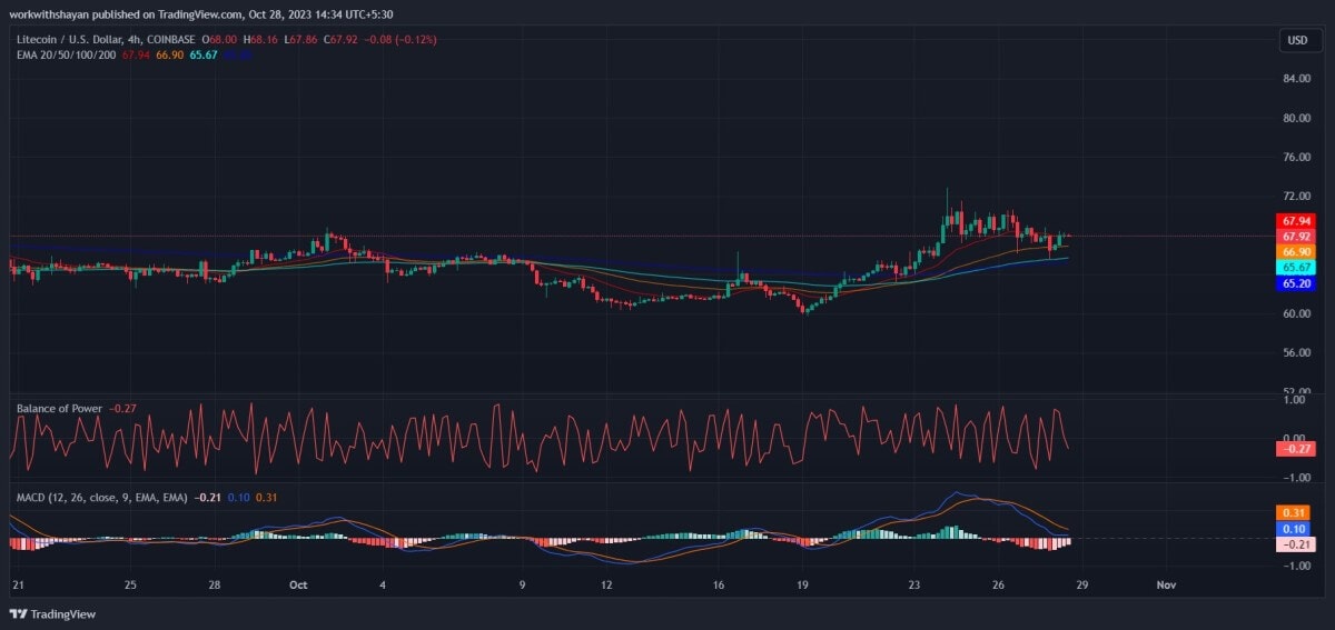The LTC price analysis for 28 October confirms that bulls are attempting to prevent a downward rally as LTC price met a surge in buying pressure from the dip of $65. However, over the last few hours, LTC price flashed minor selling pressure in breaking above the resistance level.