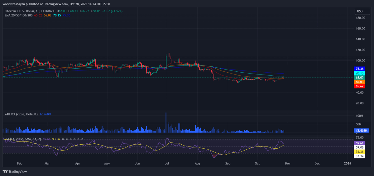 Analyzing the daily price chart, Litecoin price is currently experiencing buying activity as it made a buying pressure from the low of $65. Over the last 24 hours, LTC price triggered a heavy climb but is facing rejections to break above the crucial $70. The 24-hour volume declined to $12.4 million, showing a decreased interest in trading activity today. LTC price is currently trading at $68, increasing by over 1.4% in the last 24 hours.