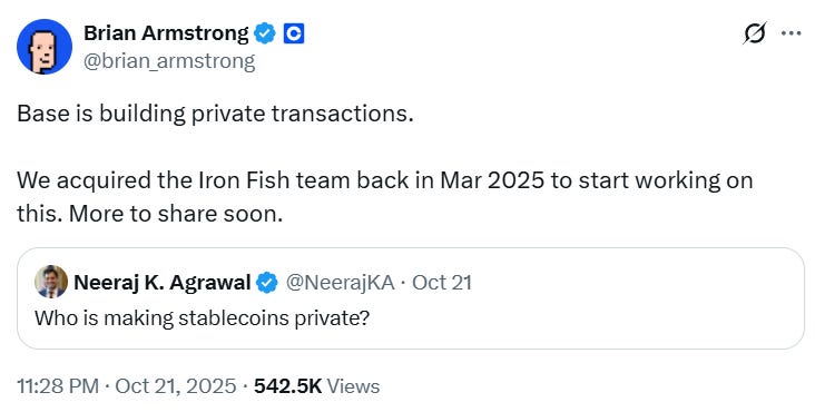 “Base is building private transactions. We acquired the Iron Fish 🐟 team back in Mar 2025 to start working on this,” wrote Coinbase’s CEO in an October 21 X announcement 📣, promising to share more details “soon.”