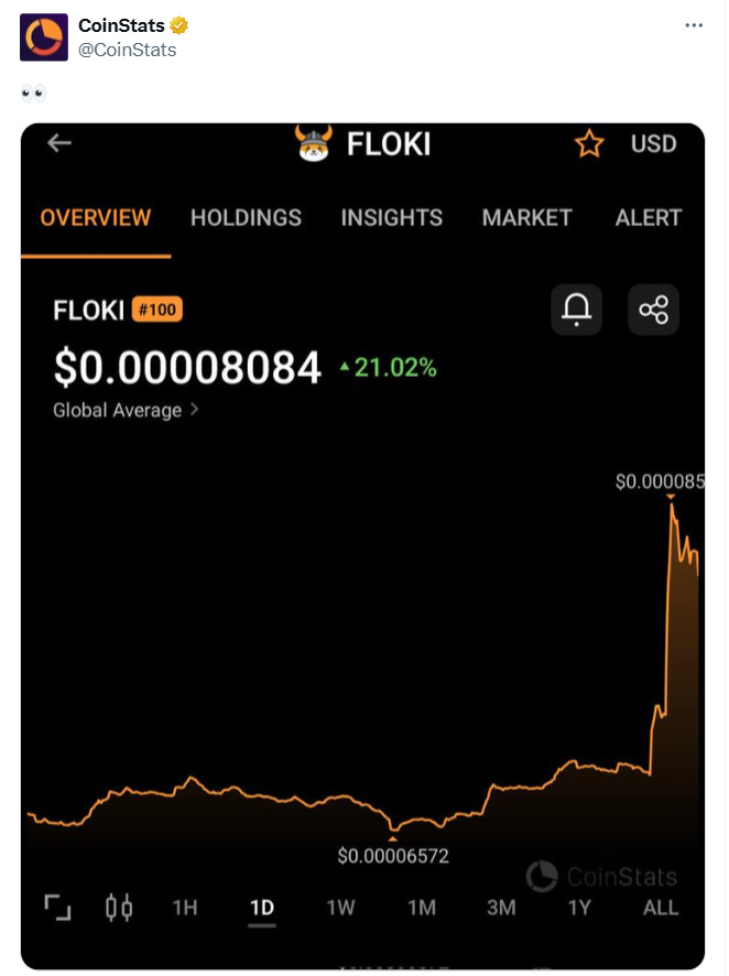 The price of the FLOKI token soared over 21% within a single day, as highlighted by CoinStats, after Elon Musk shared a picture of his Shiba Inu🐕, Floki, on his social media platform.