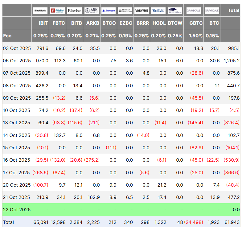 Adding to the positive signs of a market recovery, US spot Bitcoin ETFs finally interrupted their 4-day selling streak this week, with a massive inflow of $477 million on October 22.