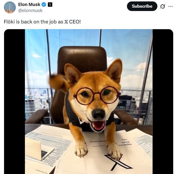 Elon Musk has previously joked about his dog running the social media company as X CEO, not himself, usually causing a pump for the dog-themed memecoin.