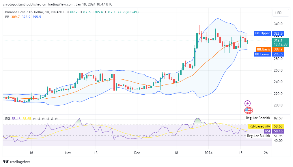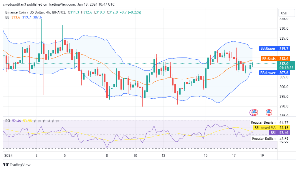 The latest one-day and four-hour Binance Coin price analysis for 18 January 2024 confirms signs of an increasing trend for the day. Although the bearish wave remained strong during the past few days, today the bulls have taken over the market once again. As the buying pressure remained high in the past 24-hours, BNB/USD value has spiked up to $312.1.