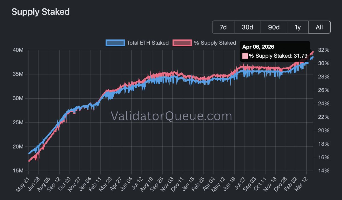 🔥 BIG: Ethereum staking nears 32% of total supply, with ~38.5M $ETH locked. pic.